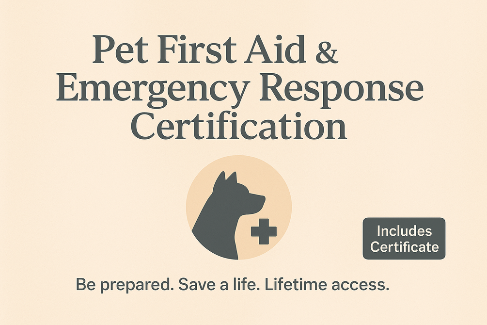 A complete online Pet First Aid & Emergency Response Certification. Learn how to recognize emergencies, respond safely, and protect your pet with confidence. Includes workbook, emergency guides, and certificate.